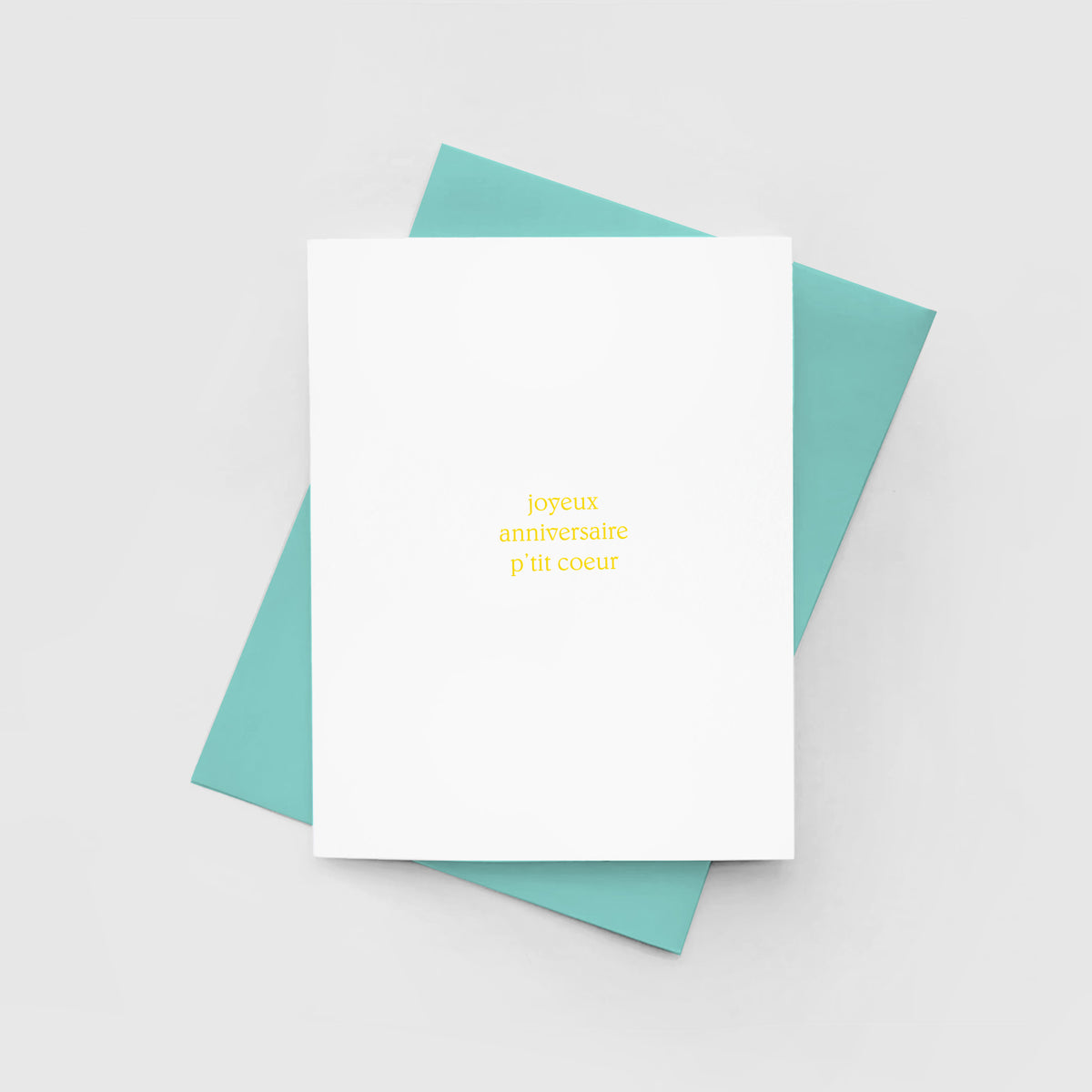 Un cadeau, c’est toujours apprécié, mais accompagné d’un mot écrit à la main dans une jolie carte, ce l’est toujours plus! Assortie d’une enveloppe turquoise, cette carte de souhaits est imprimée, pliée et emballée à la main dans notre atelier!