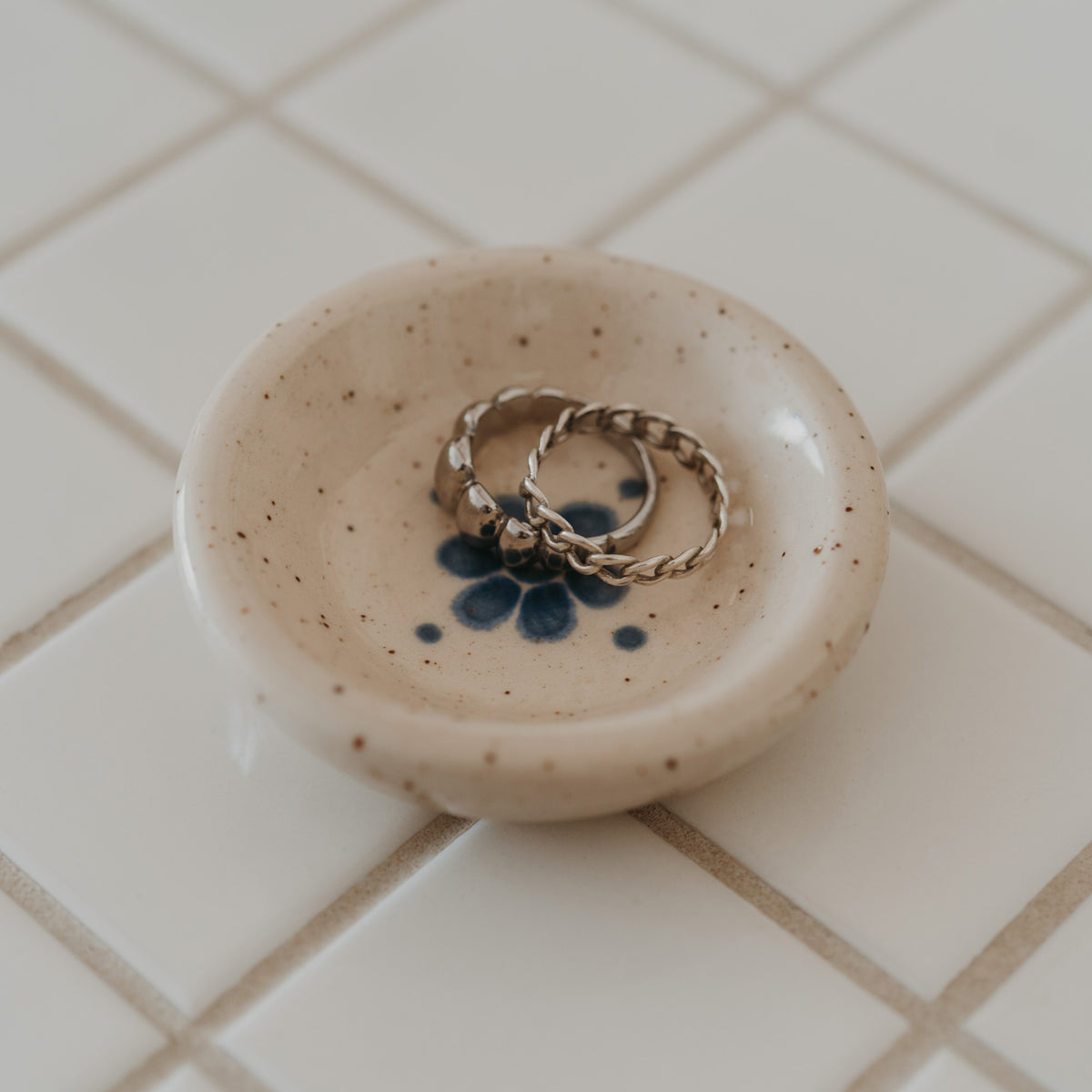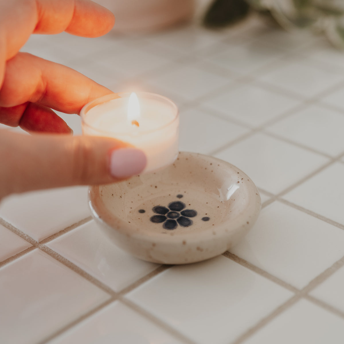 Fabriqué à la main par Les poteries de Laurence, ce petit porte-lampion enjolivé d'une petite fleur bleue est l’addition parfaite à vos moments de détente ou le parfait contenant pour y déposer vos petits bijoux.